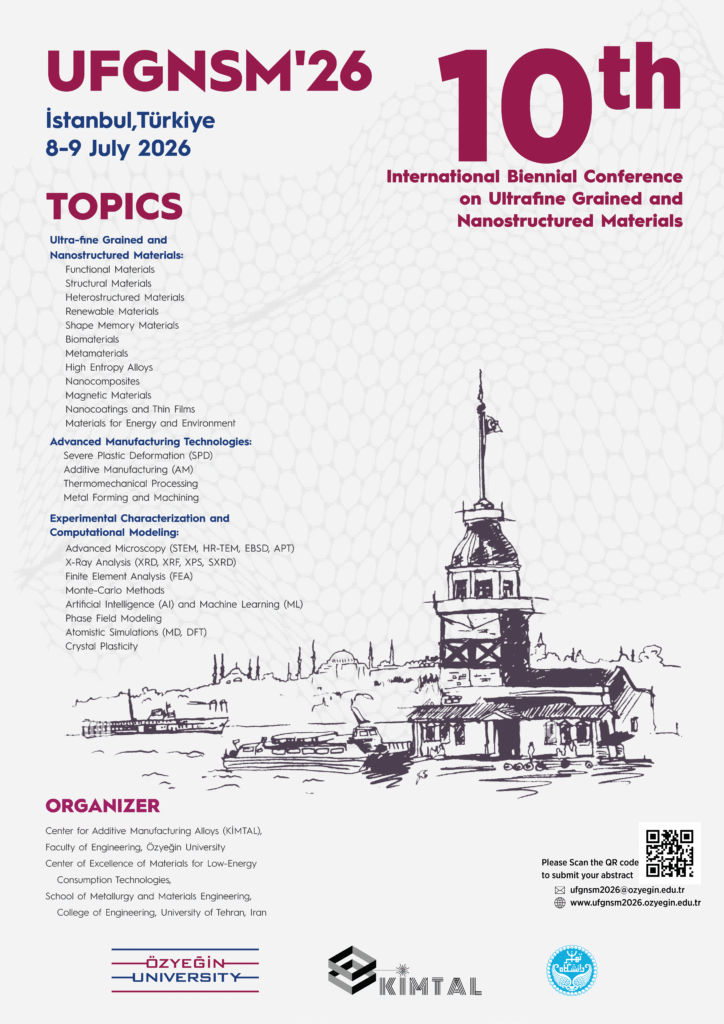 The 10th International Biennial Conference on Ultrafine Grained and Nanostructured Materials (UFGNSM2026) will be held during 8-9th of July 2026 in Istanbul. The conference is organized by Center for Additive Manufacturing Alloys (KİMTAL), Faculty of Engineering, Özyeğin University, Türkiye in a joint collaboration with Center of Excellence for Materials in Low Energy Consumption Technologies (formerly C.E. for high performance Materials), School of Metallurgy and Materials, University of Tehran. UFGNSM will feature a scientific program of Keynote lectures and invited talks by world-eminent scientists, oral and poster presentations of peer-reviewed contributions to share the most recently breaking research development in Ultrafine Grained and Nanostructured Materials.